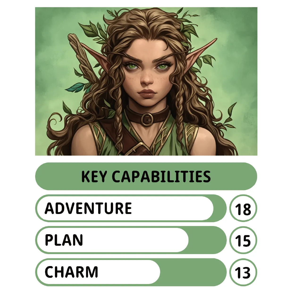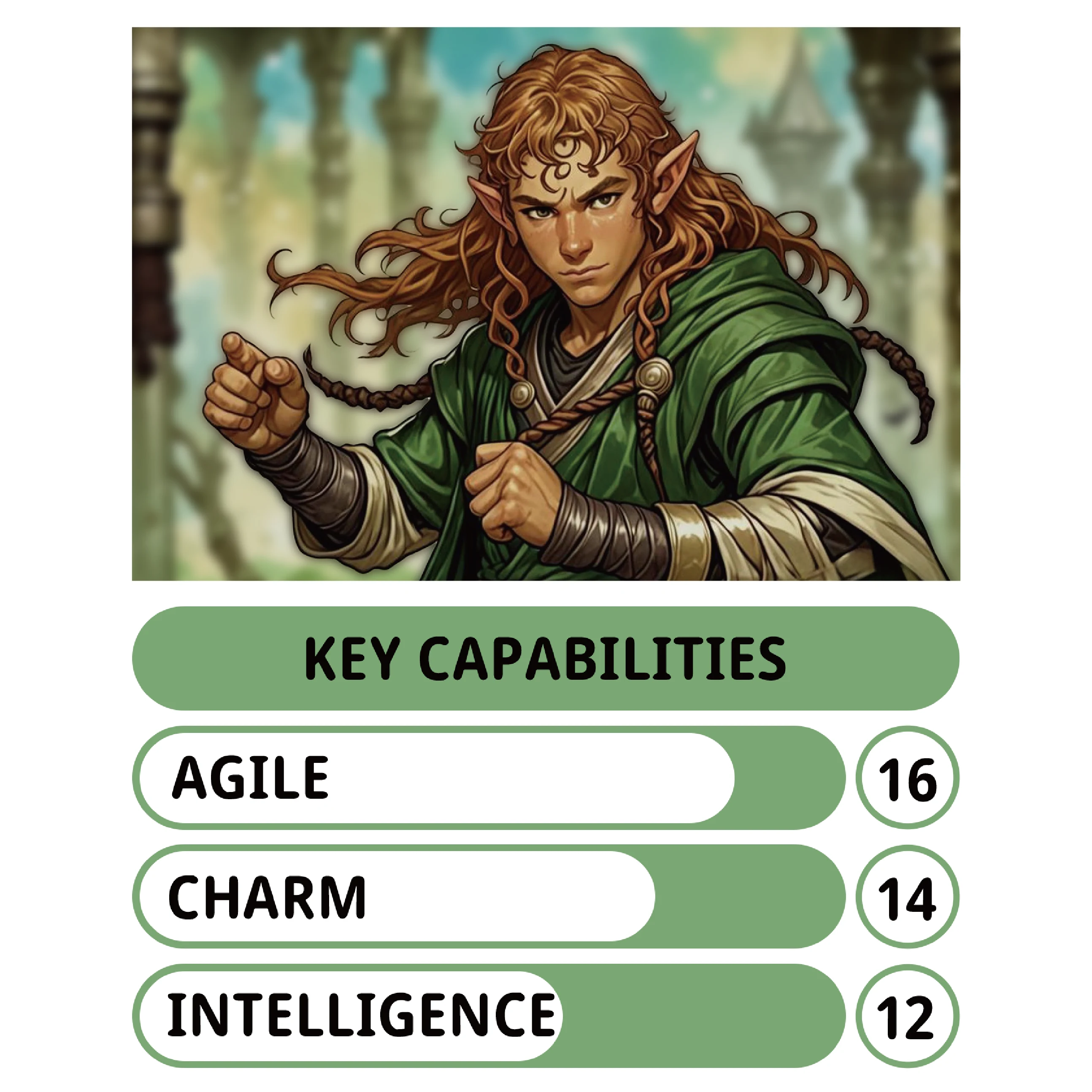 As a strategic poet among the high elves, Shava is the core think tank of the team. She uses moonlight as ink, star tracks as rulers, and dice as pens to design precise adventures in the deadly puzzles of the enchanted castle. Every roll of the dice hides her prediction of traps, the dispatch of the team, and the deduction of the traces of the holy relics. When the dusty holy relics see the light of day again, her dice are not only tools, but also batons to compose the victory movement.