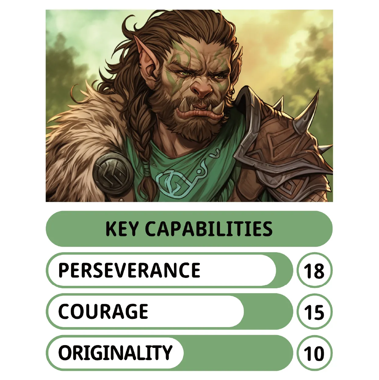 Gemma is a tall orc with a fierce appearance but a strong and gentle heart. She has loved making tools and equipment since she was a child, and is interested in combat strategies and teamwork. She is calm and down-to-earth, and is the kind of reliable character who will never back down at critical moments.