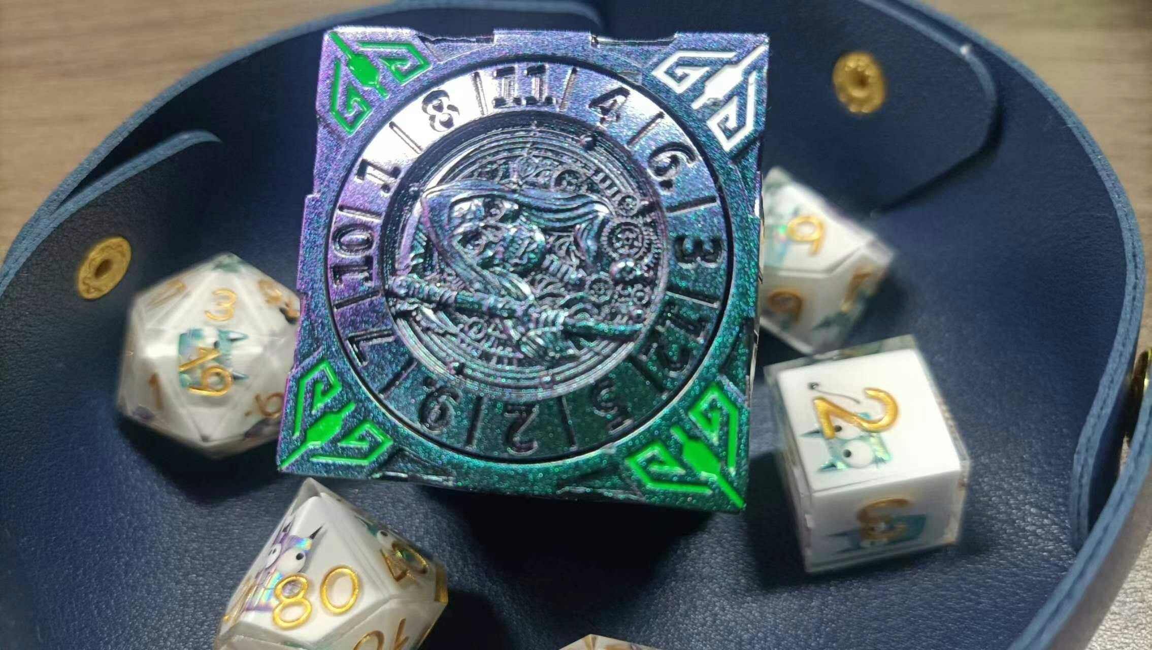 We have innovatively launched a six-sided Rubik's cube metal DND dice turntable. Combining the six-sided Rubik's cube dice with the fidget spinner dice, each side of the Rubik's cube dice is engraved with circular rotating roulette dice D4, D6, D8, D10, D12, D20, of which D10 and D100 share Arabic. Each side of this cubic six-sided spinning dice is meticulously engraved with legendary characters from the Dungeons & Dragons role-playing world, such as undead skeletons, majestic dragons, terrifying deep-sea octopus tentacles, dark skeleton wizards, winged Pegasus, crocodile monsters, and more.
